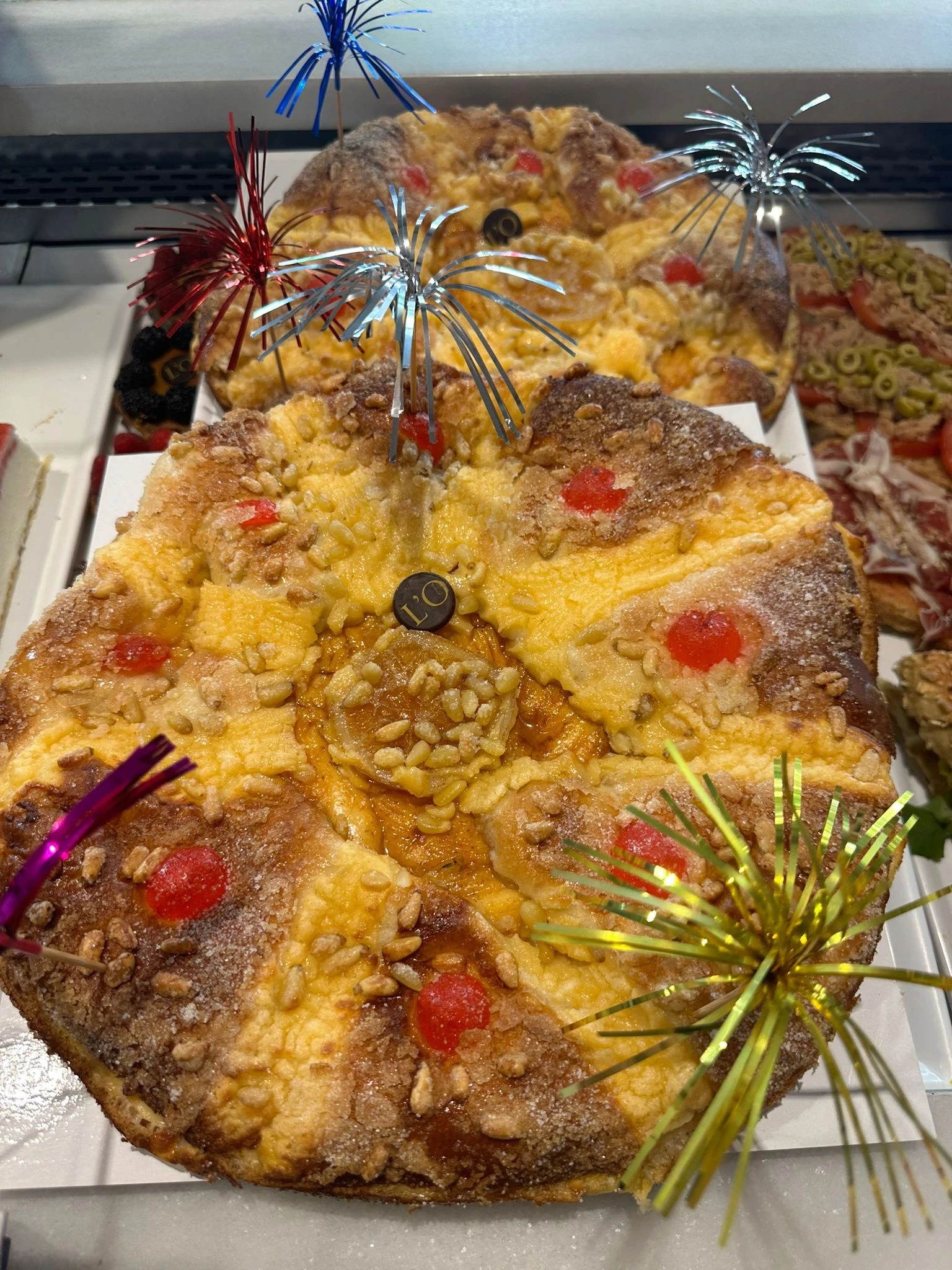 -Crema, pintada con huevo y decorada con naranja y crujientes piñones.